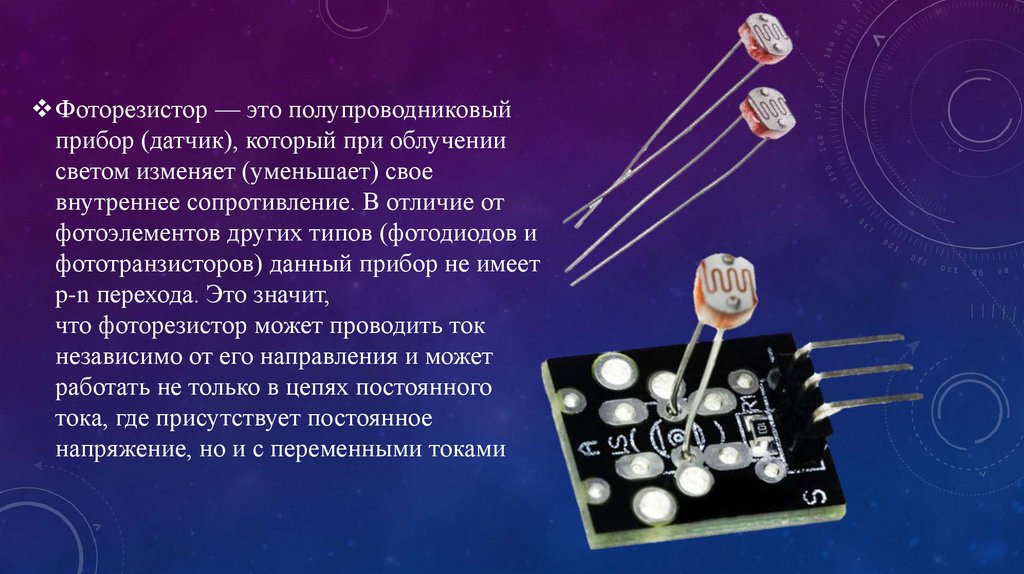 Фоторезистор — это полупроводниковыйприбор (датчик), который при облучении