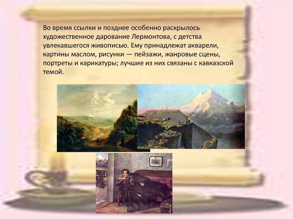 Во время ссылки и позднее особенно раскрылосьхудожественное дарование Лермонтова, с детства