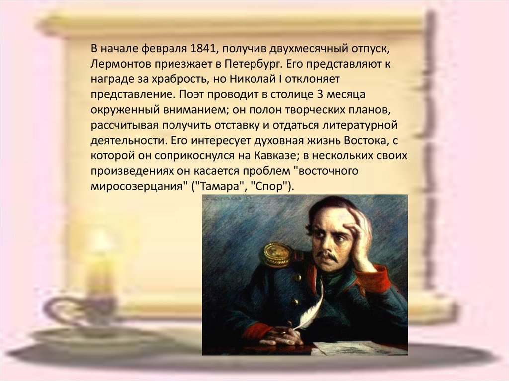 В начале февраля 1841, получив двухмесячный отпуск,Лермонтов приезжает в Петербург. Его представляют к