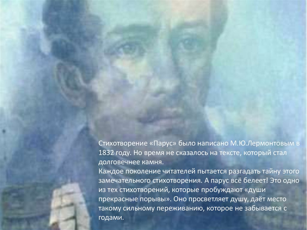 Стихотворение «Парус» было написано М.Ю.Лермонтовым в1832 году. Но время не сказалось на тексте, который стал