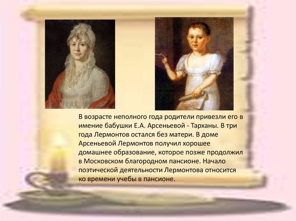 Воспитание Лермонтова ложится на плечибабушки. Детство маленького Мишеля прошло в