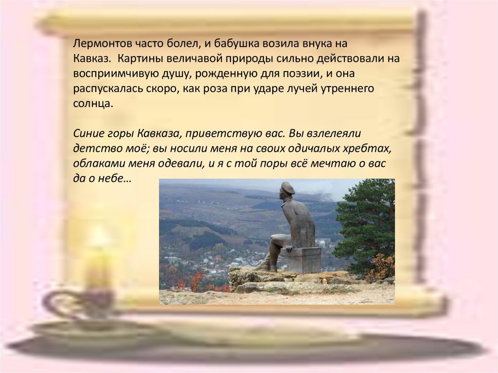 Лермонтов часто болел, и бабушка возила внука наКавказ. Картины величавой природы сильно действовали на
