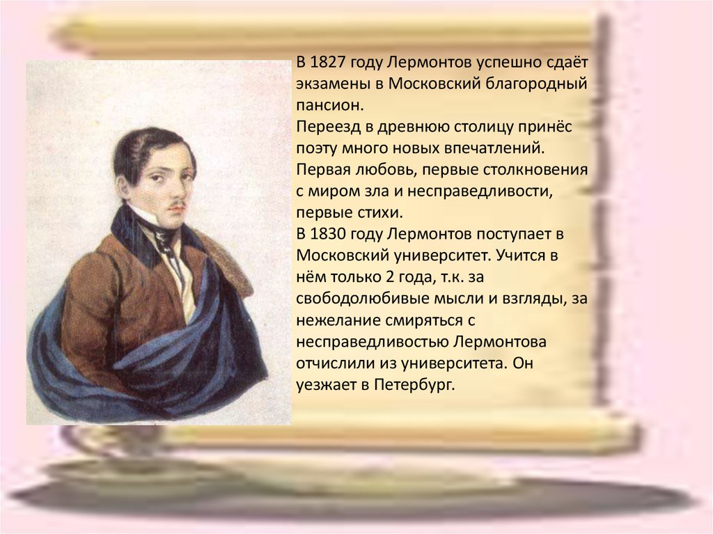 В 1827 году Лермонтов успешно сдаётэкзамены в Московский благородный