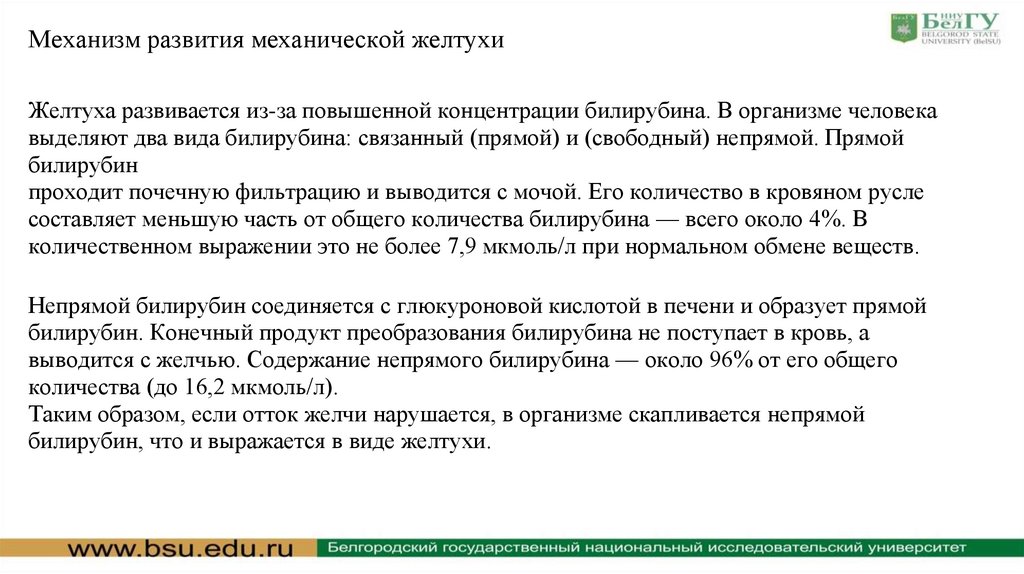 Механизм развития механической желтухиЖелтуха развивается из-за повышенной концентрации билирубина. В организме человека