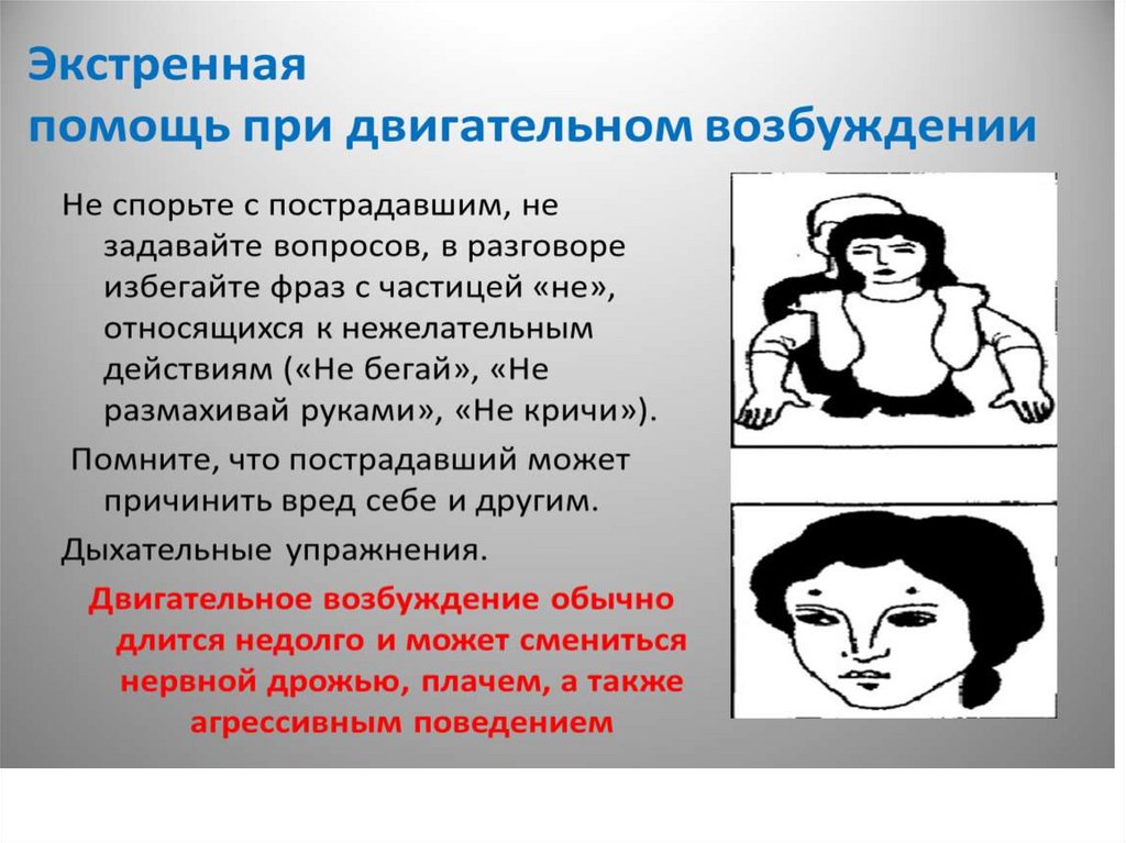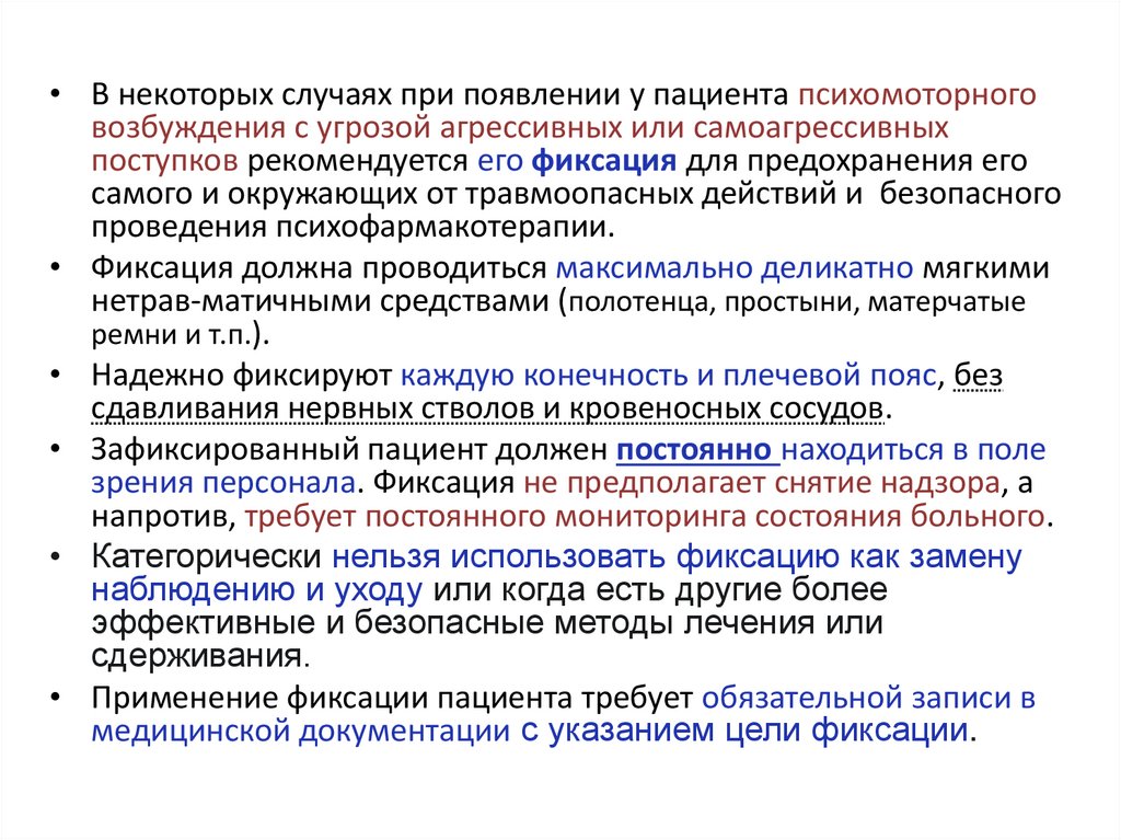 • В некоторых случаях при появлении у пациента психомоторноговозбуждения с угрозой агрессивных или самоагрессивных