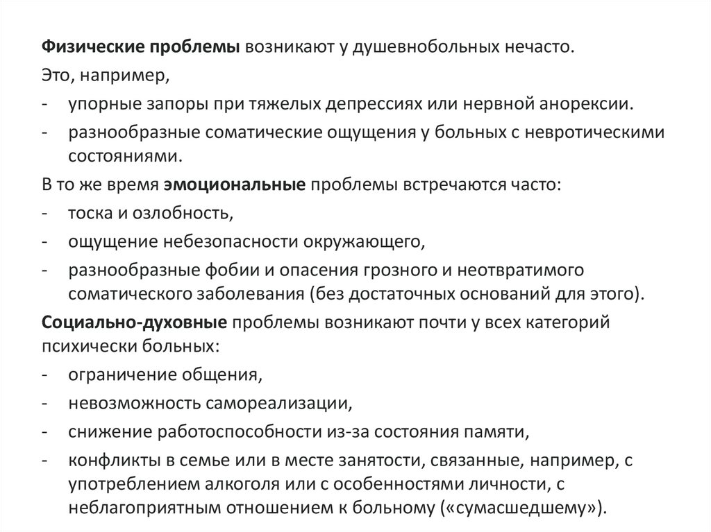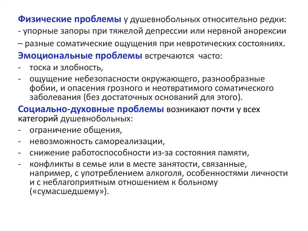 Физические проблемы у душевнобольных относительно редки:- упорные запоры при тяжелой депрессии или нервной анорексии