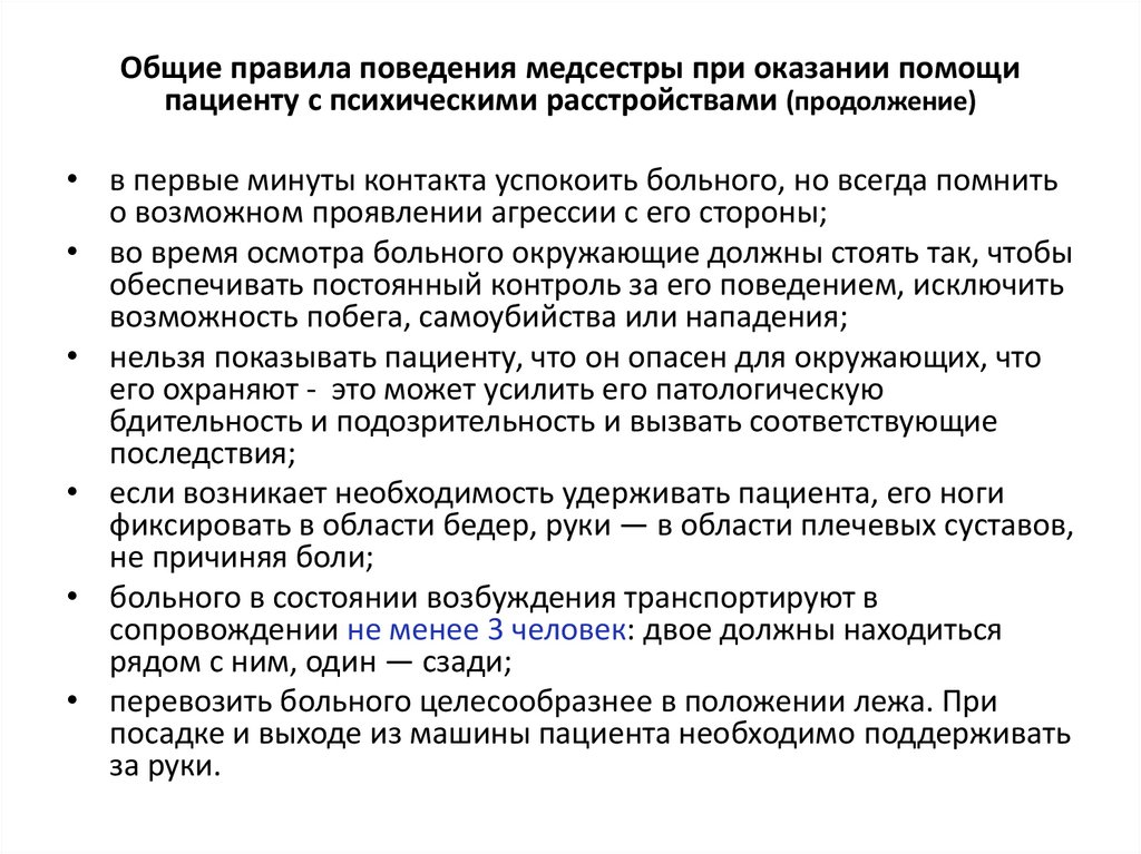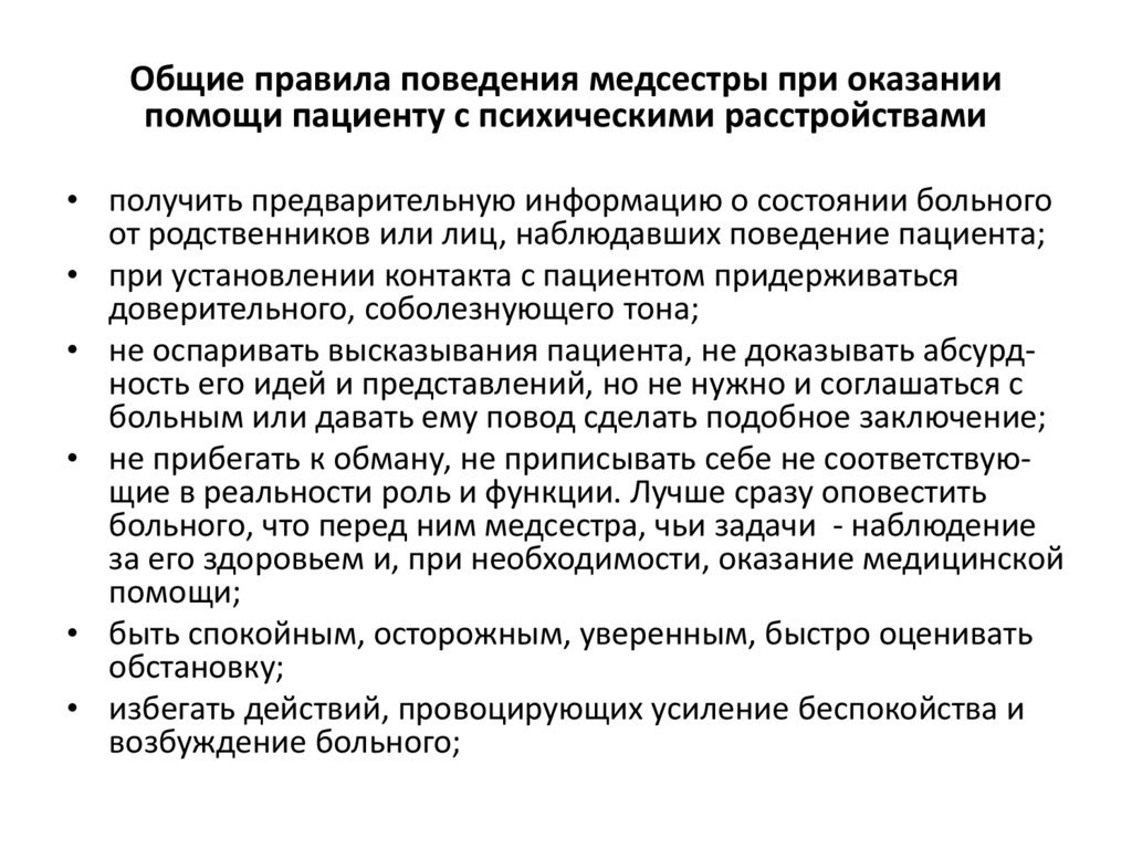 Общие правила поведения медсестры при оказаниипомощи пациенту с психическими расстройствами