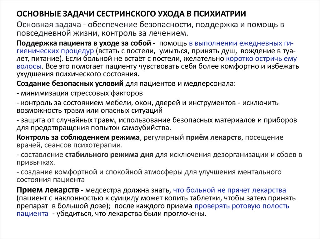 ОСНОВНЫЕ ЗАДАЧИ СЕСТРИНСКОГО УХОДА В ПСИХИАТРИИОсновная задача - обеспечение безопасности, поддержка и помощь в
