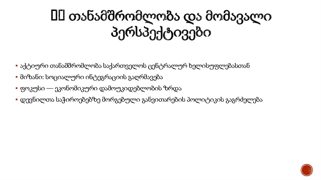 აქტიური თანამშრომლობა საქართველოს ცენტრალურ ხელისუფლებასთანმიზანი: სოციალური ინტეგრაციის გაღრმავება