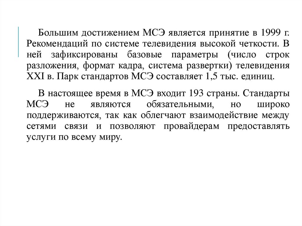 Большим достижением МСЭ является принятие в 1999 г.Рекомендаций по системе телевидения высокой четкости. В