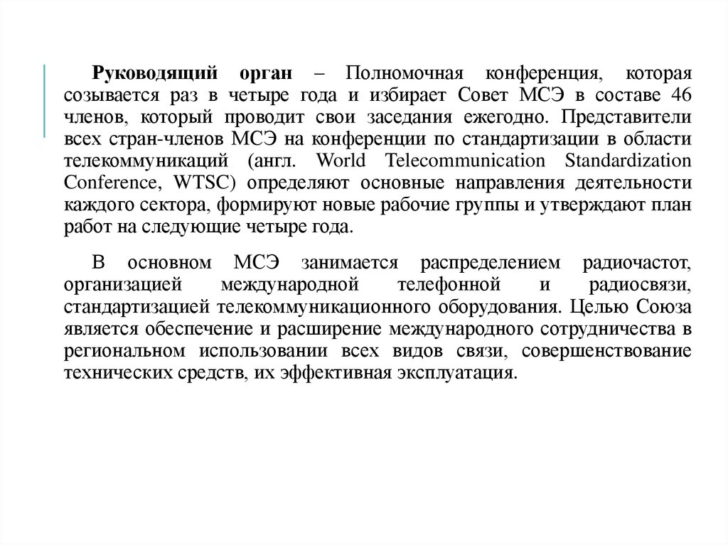 Руководящий орган – Полномочная конференция, котораясозывается раз в четыре года и избирает Совет МСЭ в составе 46