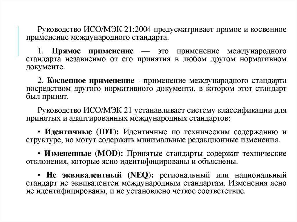 Руководство ИСО/МЭК 21:2004 предусматривает прямое и косвенноеприменение международного стандарта.