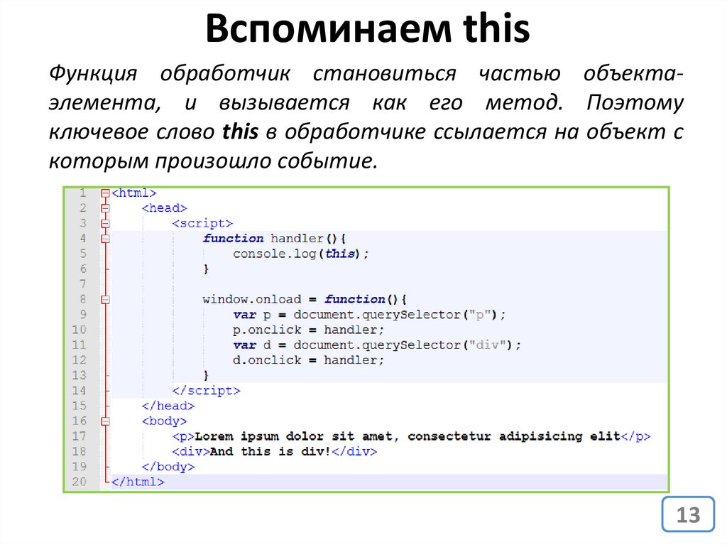 Вспоминаем thisФункция обработчик становиться частью объектаэлемента, и вызывается как его метод. Поэтому