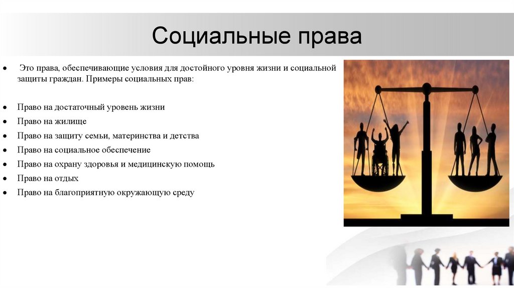 Социальные праваЭто права, обеспечивающие условия для достойного уровня жизни и социальной