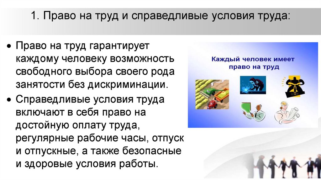 1. Право на труд и справедливые условия труда:Право на труд гарантирует