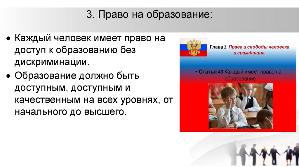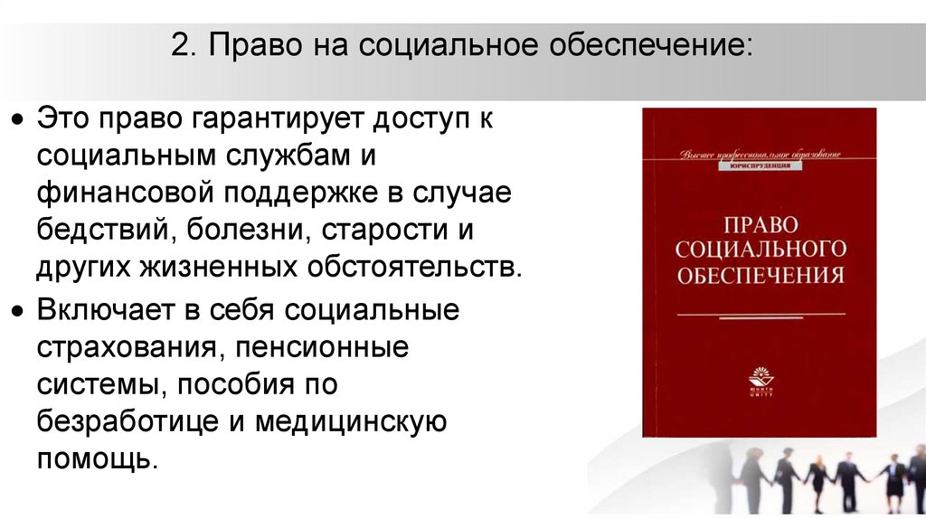 2. Право на социальное обеспечение:Это право гарантирует доступ к