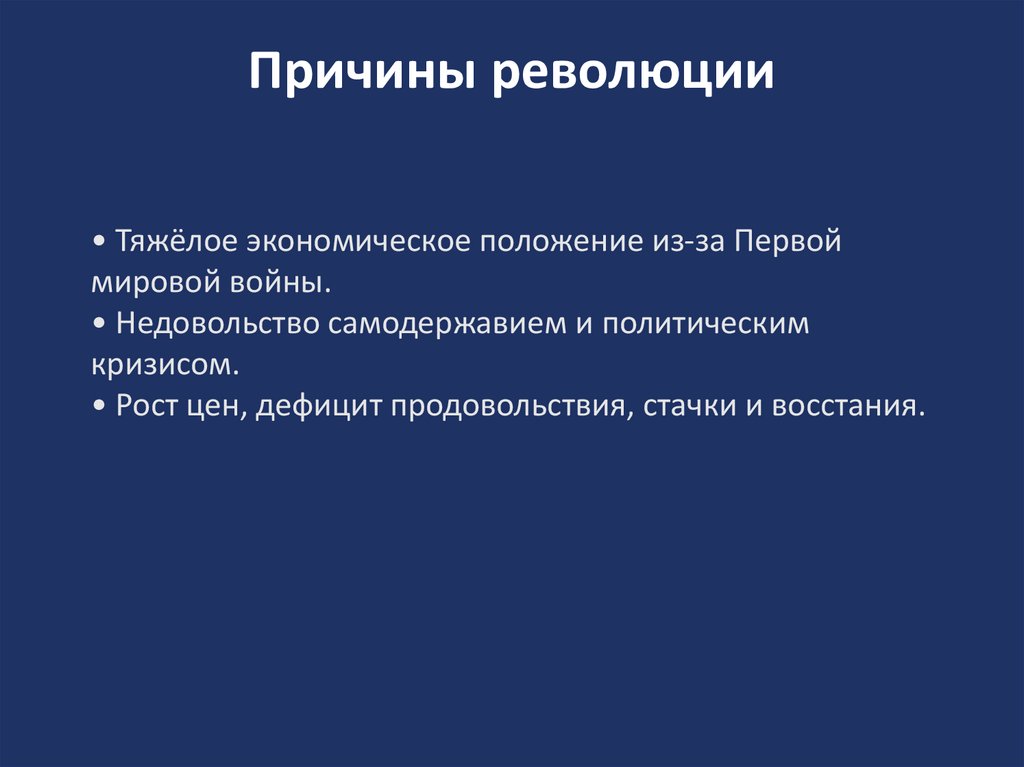 Причины революции• Тяжёлое экономическое положение из-за Первой