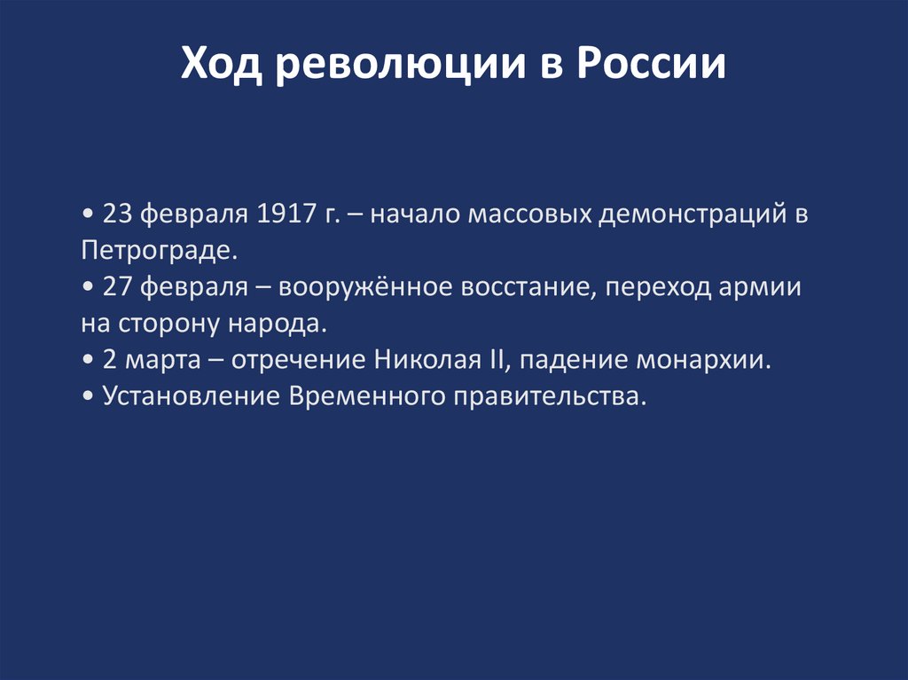 Ход революции в России• 23 февраля 1917 г. – начало массовых демонстраций в