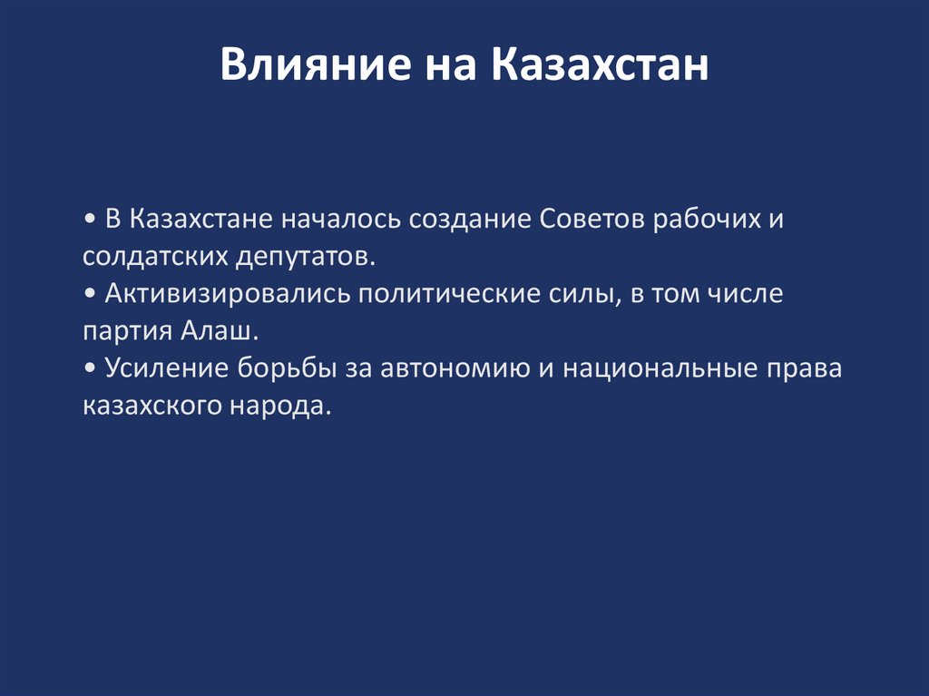 Влияние на Казахстан• В Казахстане началось создание Советов рабочих и