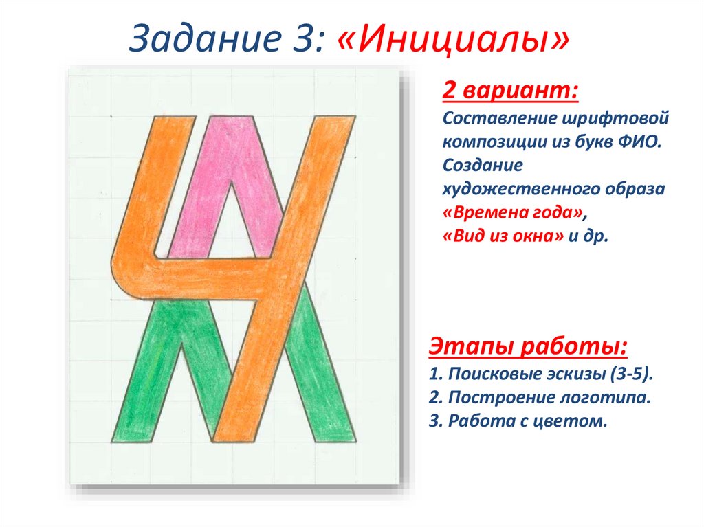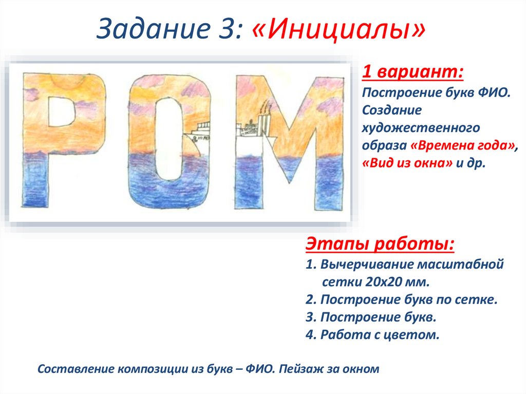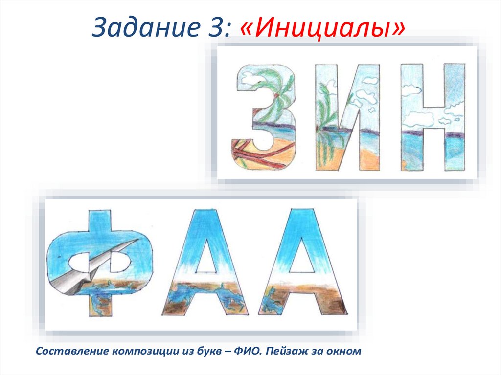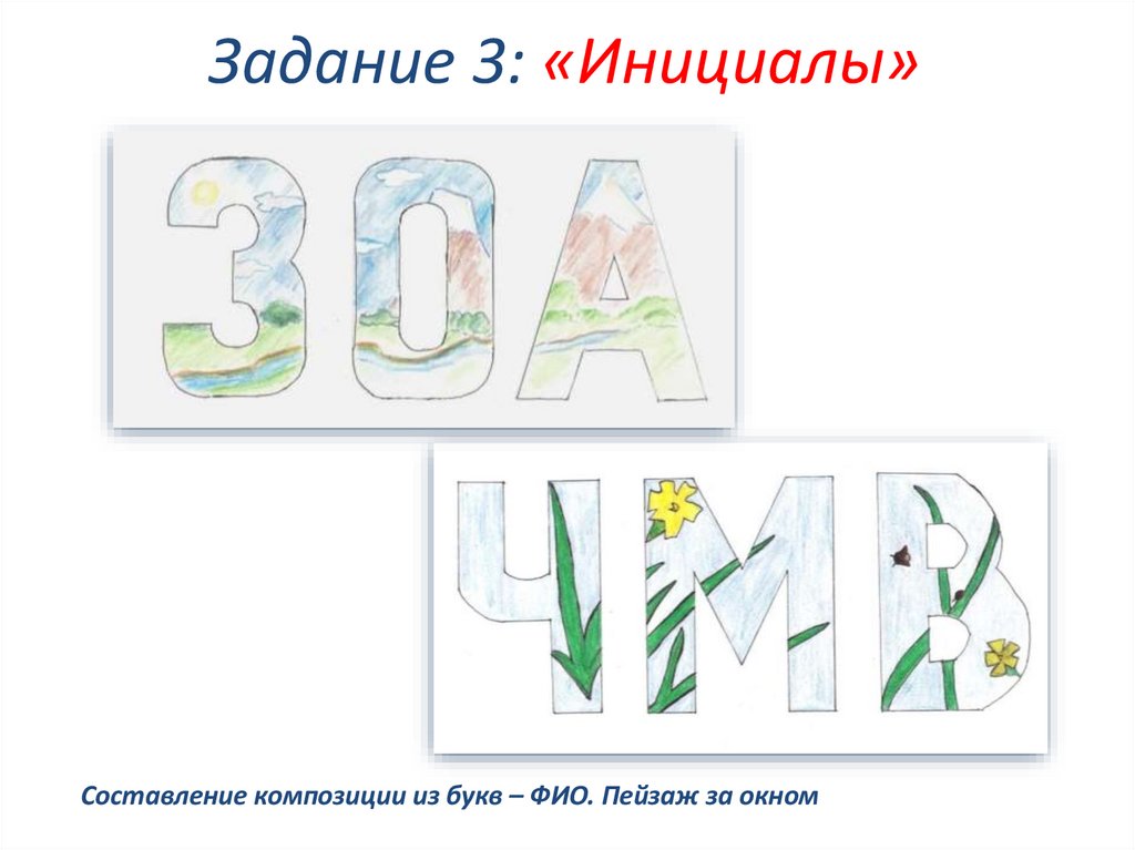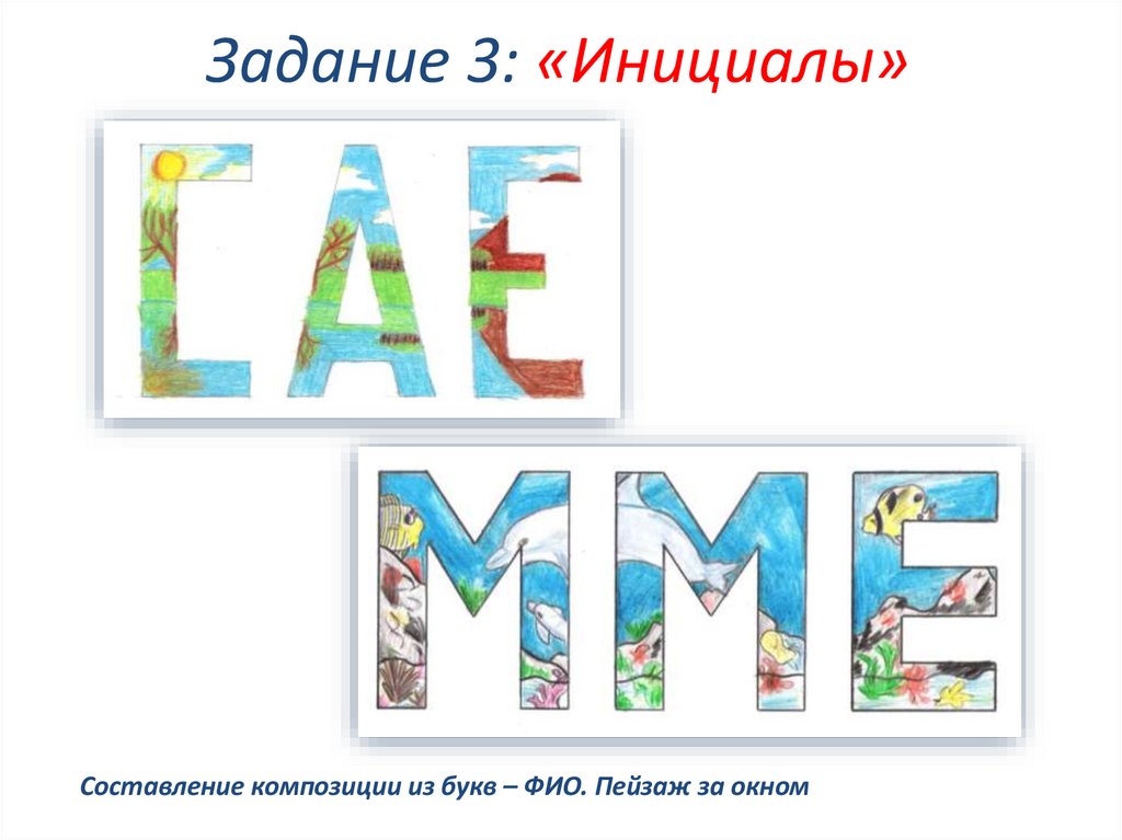 Задание 3: «Инициалы»Составление композиции из букв – ФИО. Пейзаж за окном