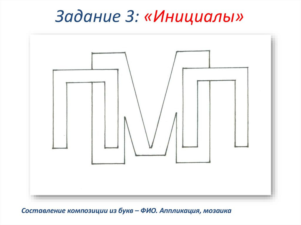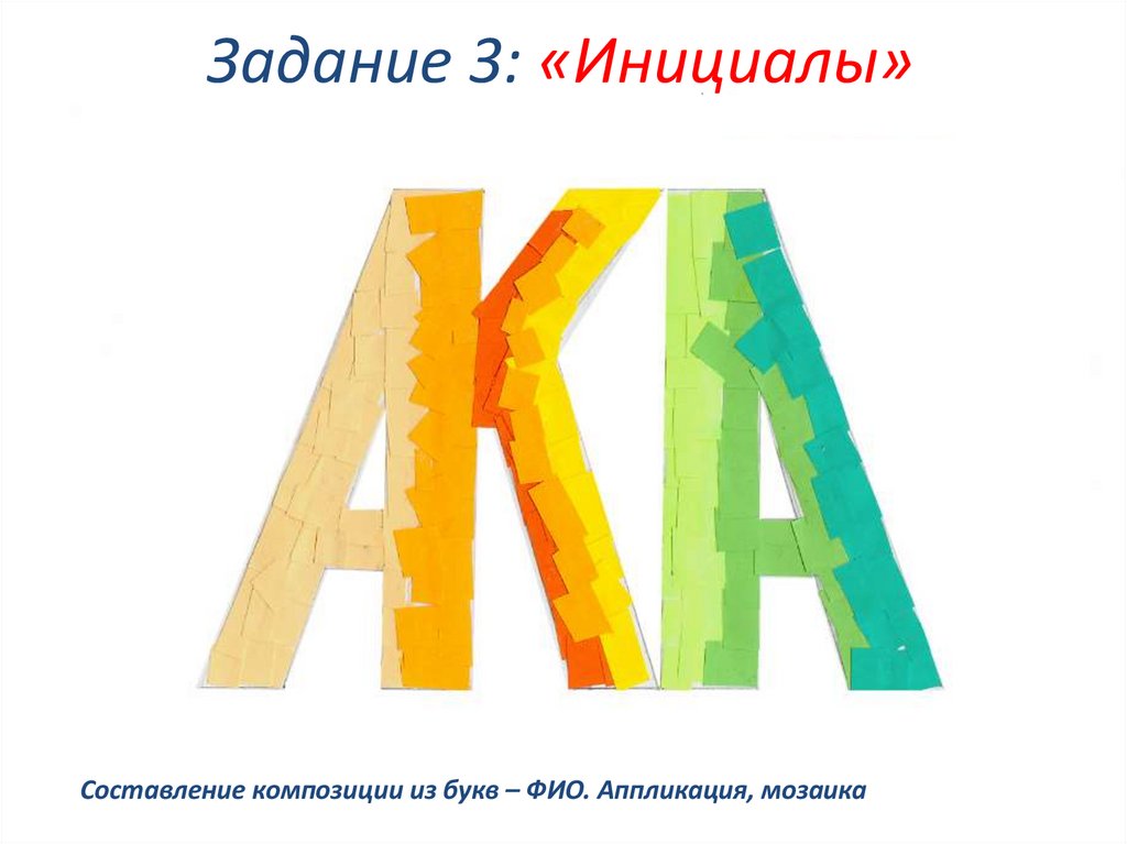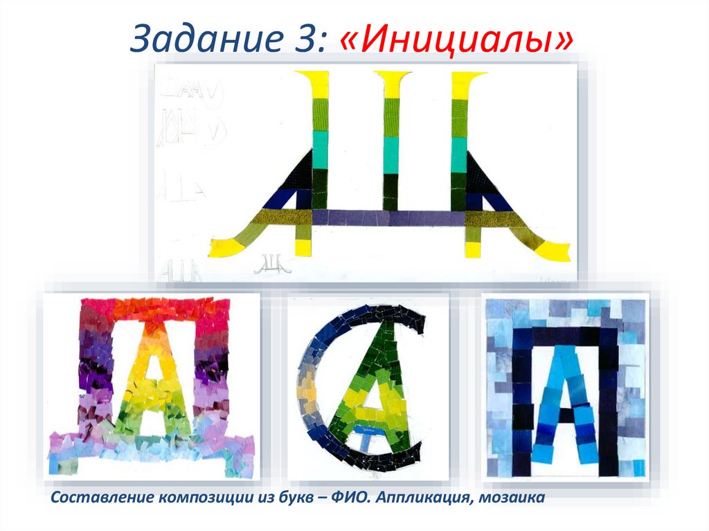 Задание 3: «Инициалы»Составление композиции из букв – ФИО. Аппликация, мозаика