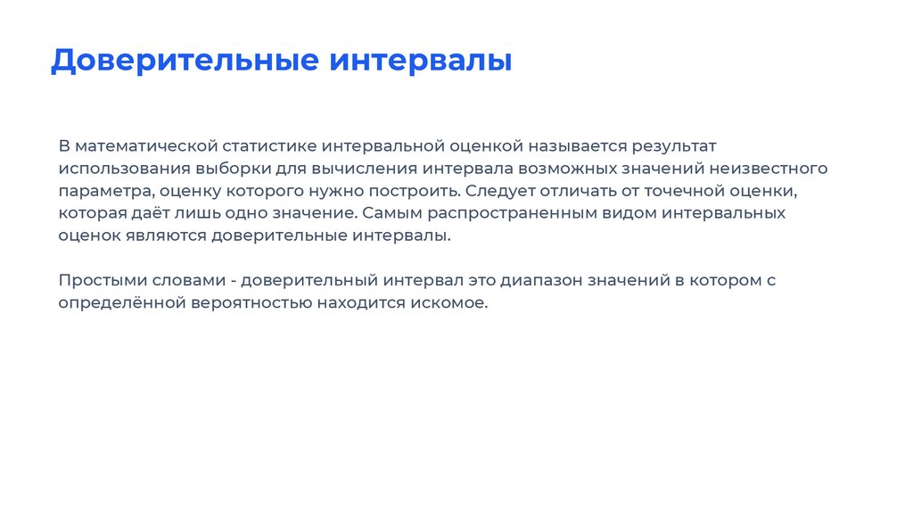 Доверительные интервалыВ математической статистике интервальной оценкой называется результат