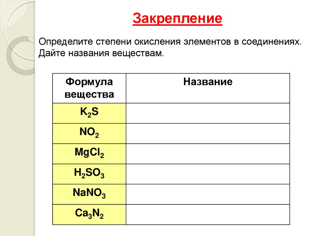 ЗакреплениеОпределите степени окисления элементов в соединениях.