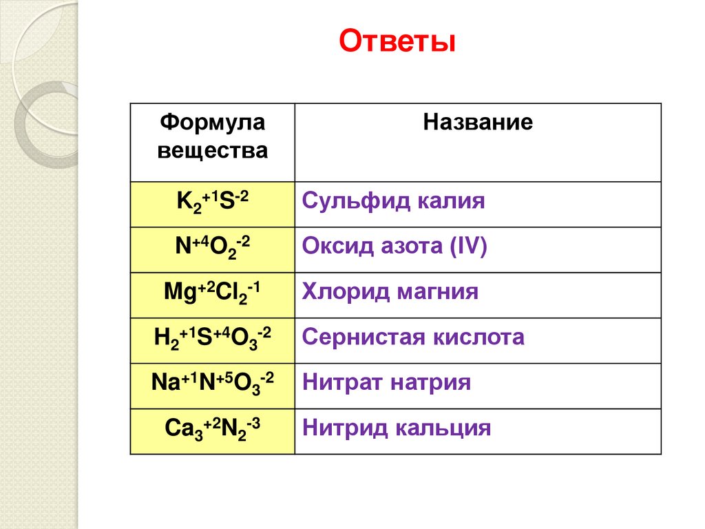 Например, СаО – оксид кальция, NaCl – хлорид натрия, PbS – сульфид свинца.