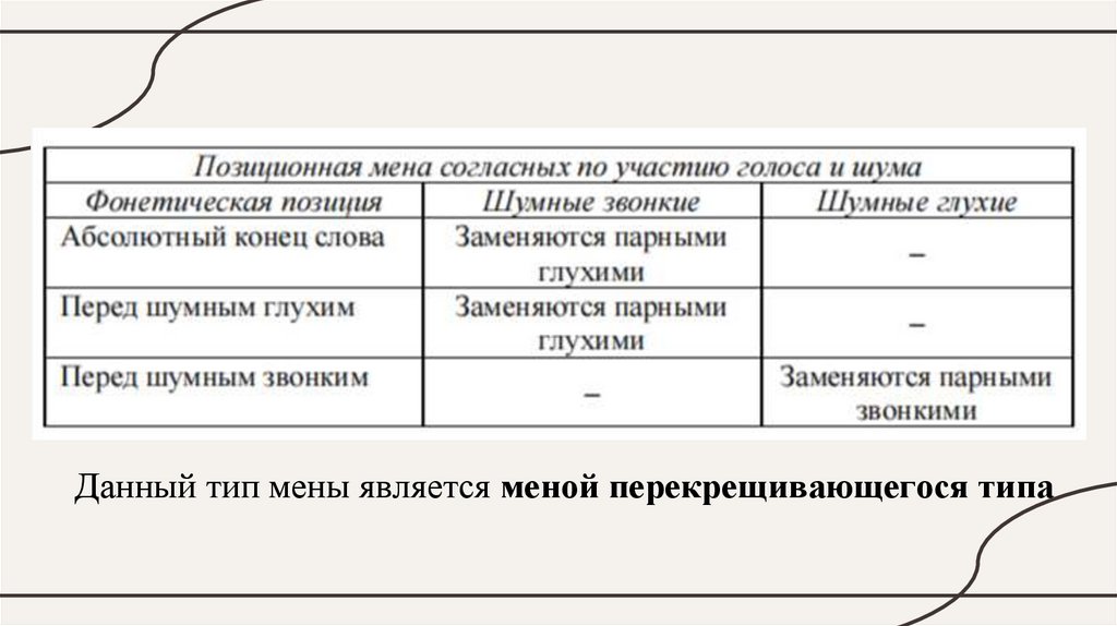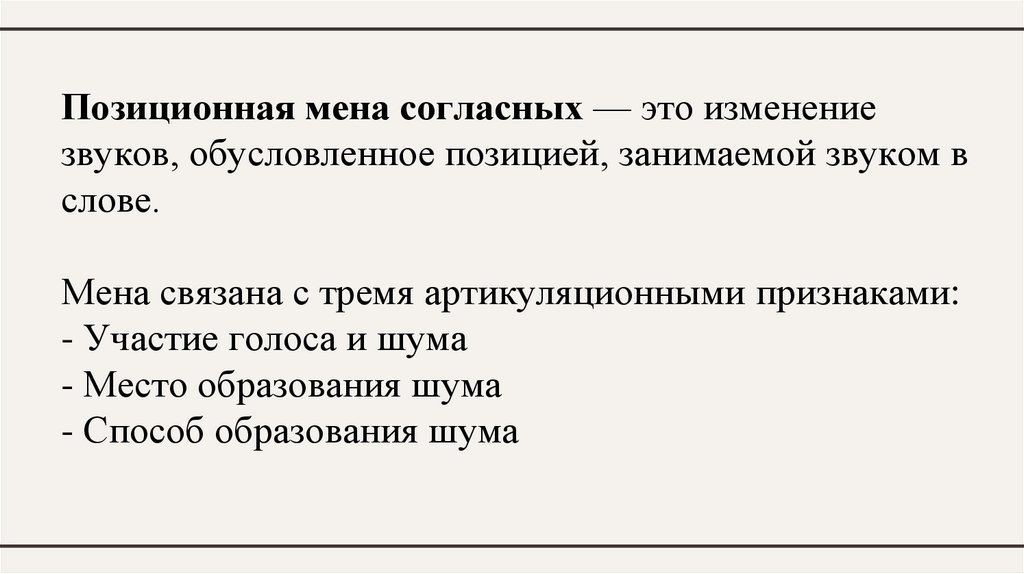Позиционная мена согласных — это изменениезвуков, обусловленное позицией, занимаемой звуком в