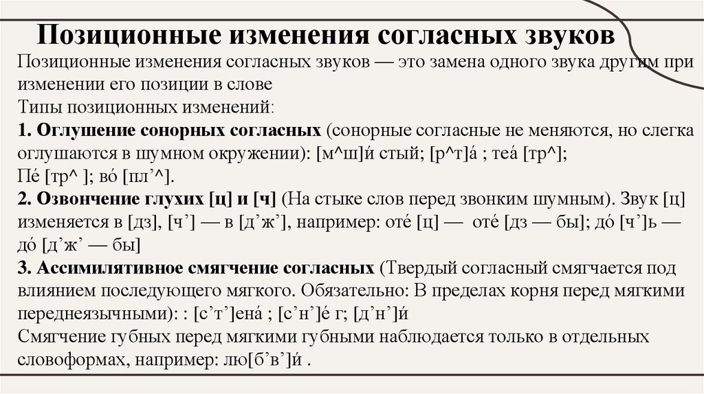 Позиционные изменения согласных звуковПозиционные изменения согласных звуков — это замена одного звука другим при