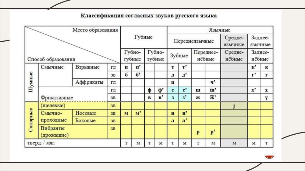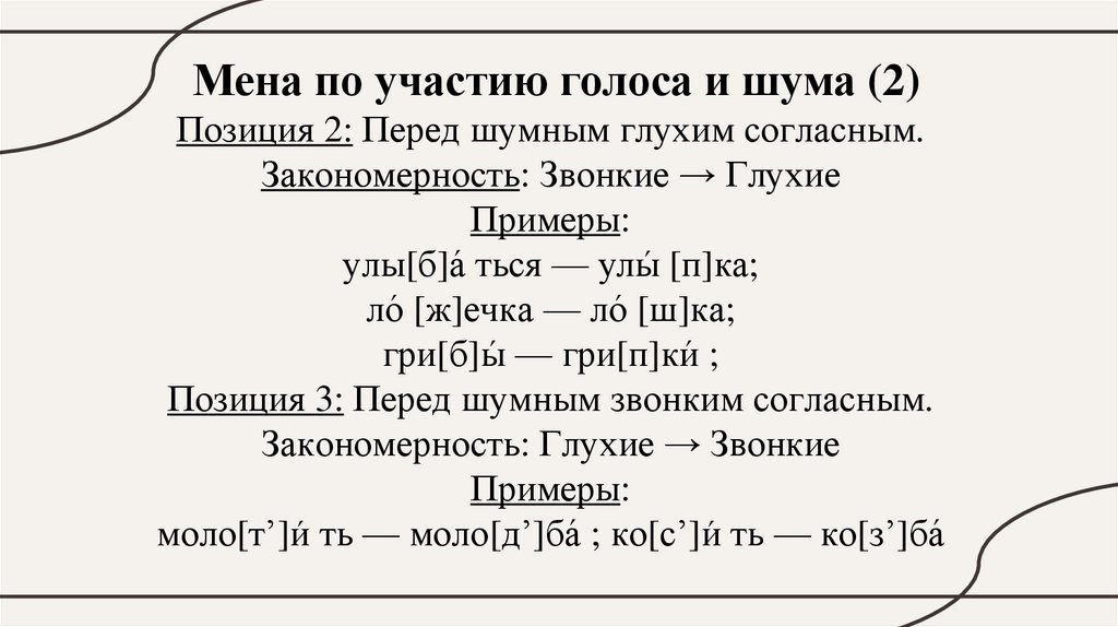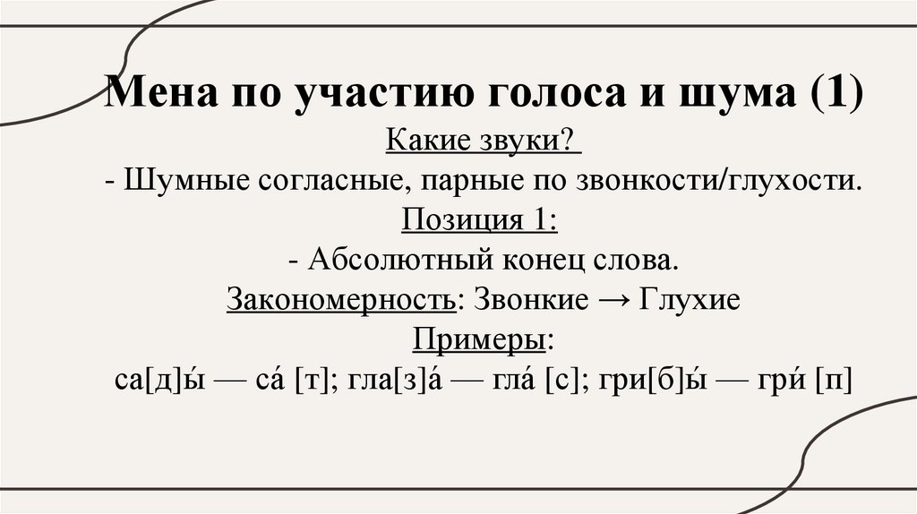 1. Оглушение сонорных согласных (сонорные согласные не меняются, но слегка