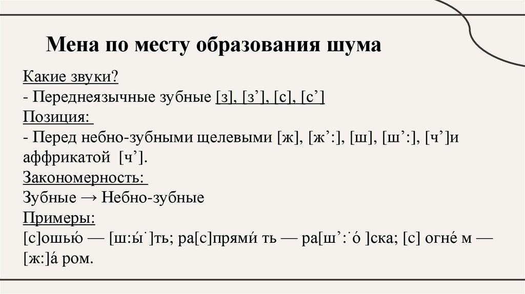 - Перед небно-зубными щелевыми [ж], [ж’:], [ш], [ш’:], [ч’]и