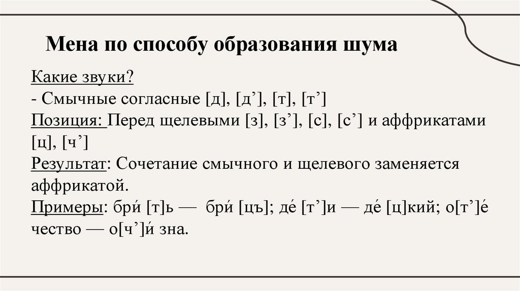 Примеры: бри́ [т]ь — бри́ [цъ]; де́ [т’]и — де́ [ц]кий; о[т’]е́