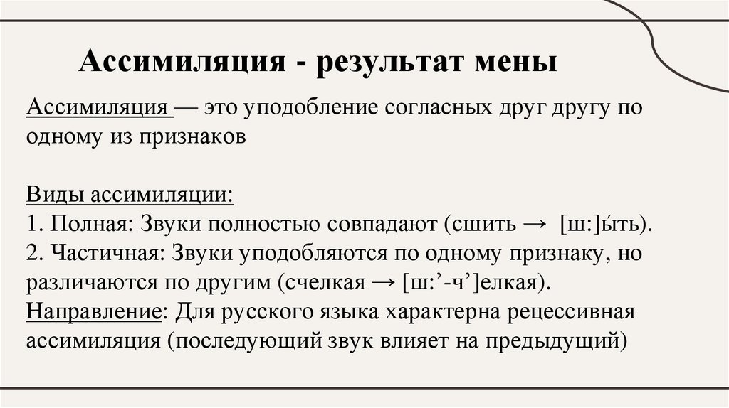 Ассимиляция - результат меныАссимиляция — это уподобление согласных друг другу по