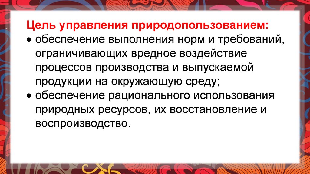 Цель управления природопользованием:обеспечение выполнения норм и требований,