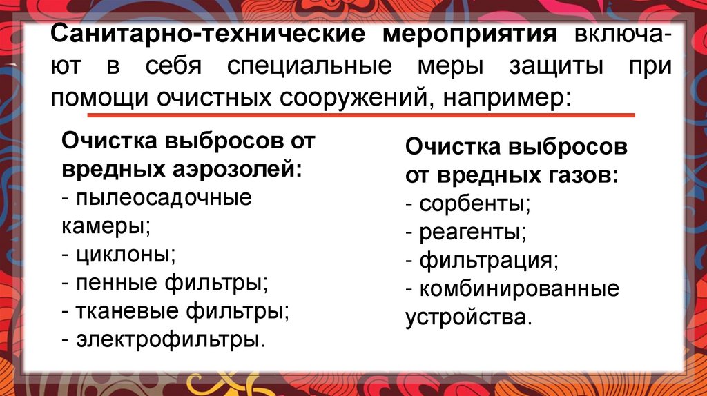 Санитарно-технические мероприятия включают в себя специальные меры защиты припомощи очистных сооружений, например: