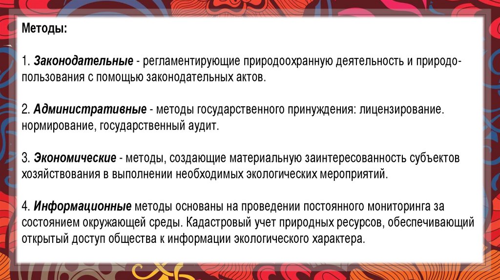 Методы:1. Законодательные - регламентирующие природоохранную деятельность и природопользования с помощью законодательных актов.