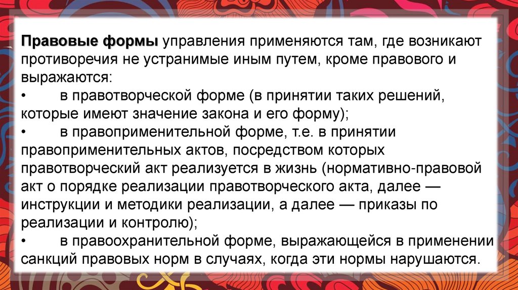 Правовые формы управления применяются там, где возникаютпротиворечия не устранимые иным путем, кроме правового и