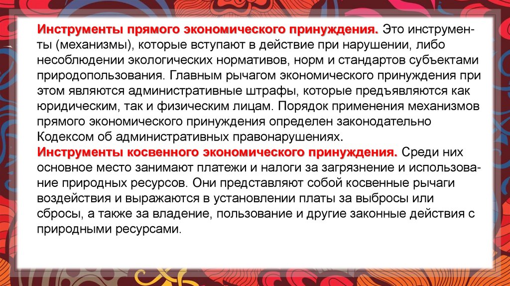 Инструменты прямого экономического принуждения. Это инструменты (механизмы), которые вступают в действие при нарушении, либонесоблюдении экологических нормативов, норм и стандартов субъектами