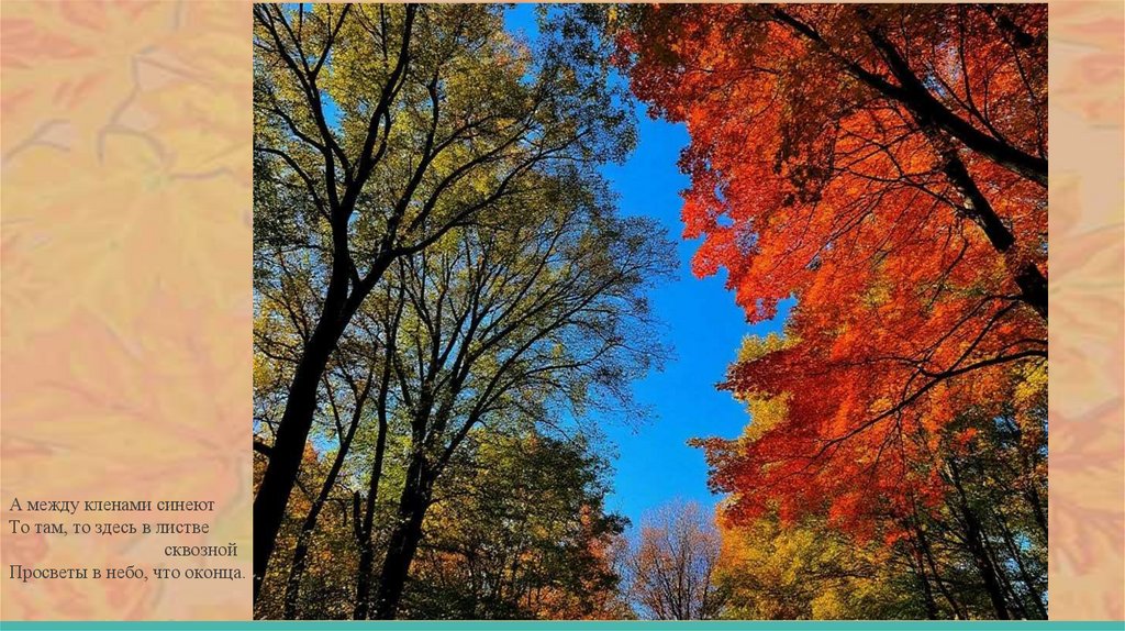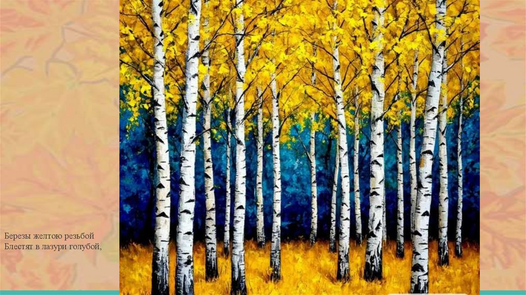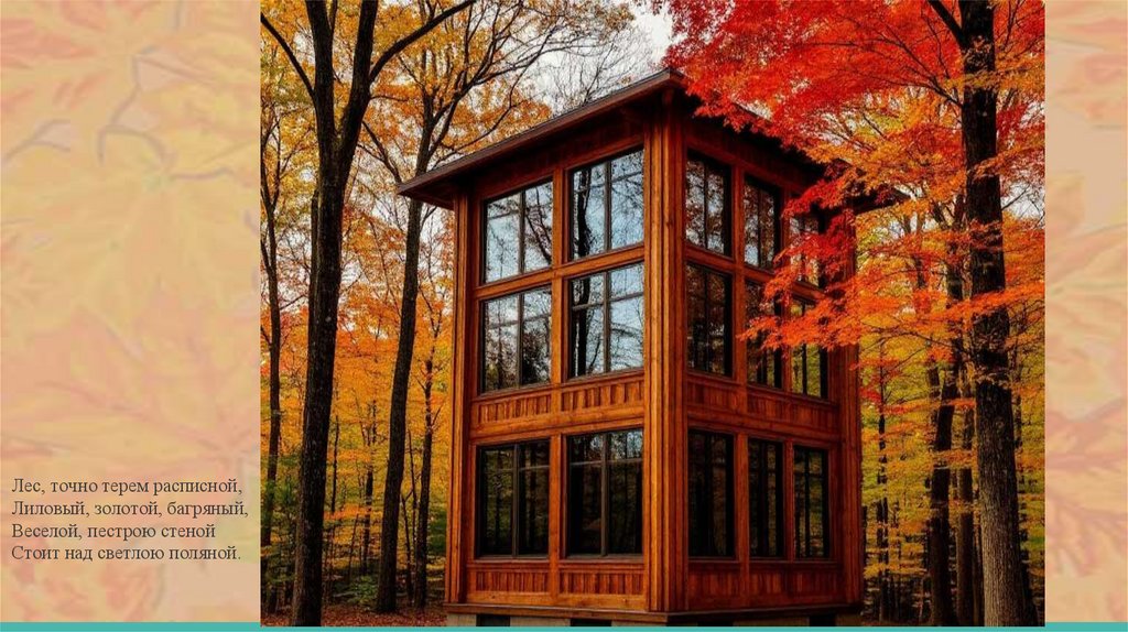 Лес, точно терем расписной,Лиловый, золотой, багряный,