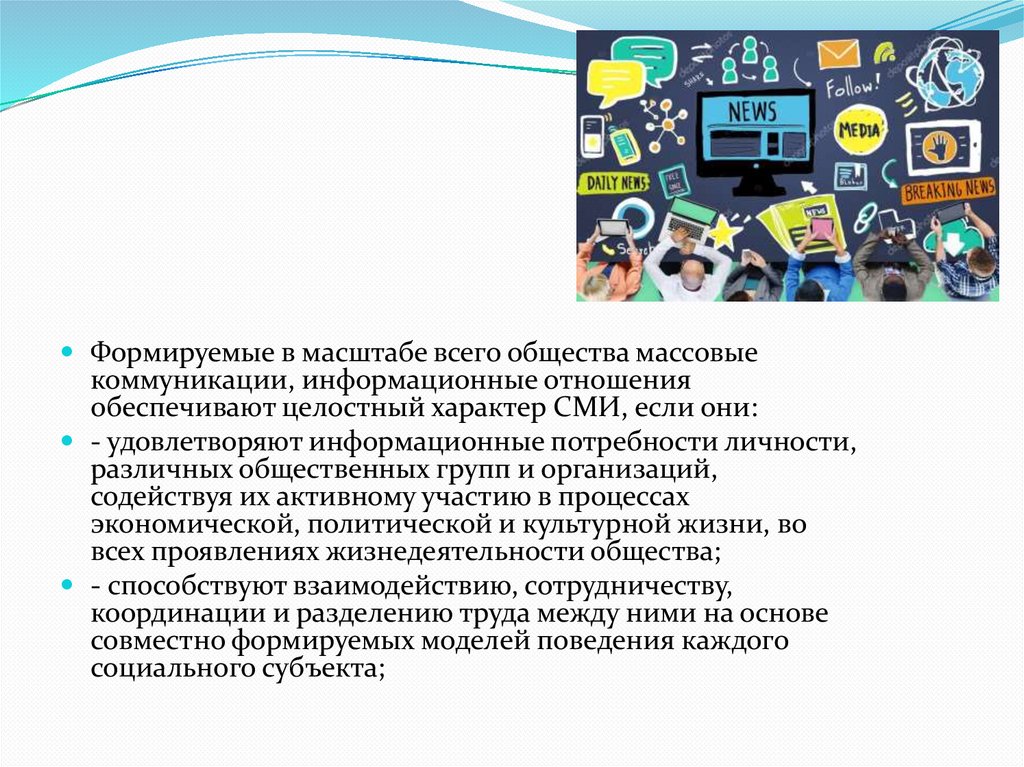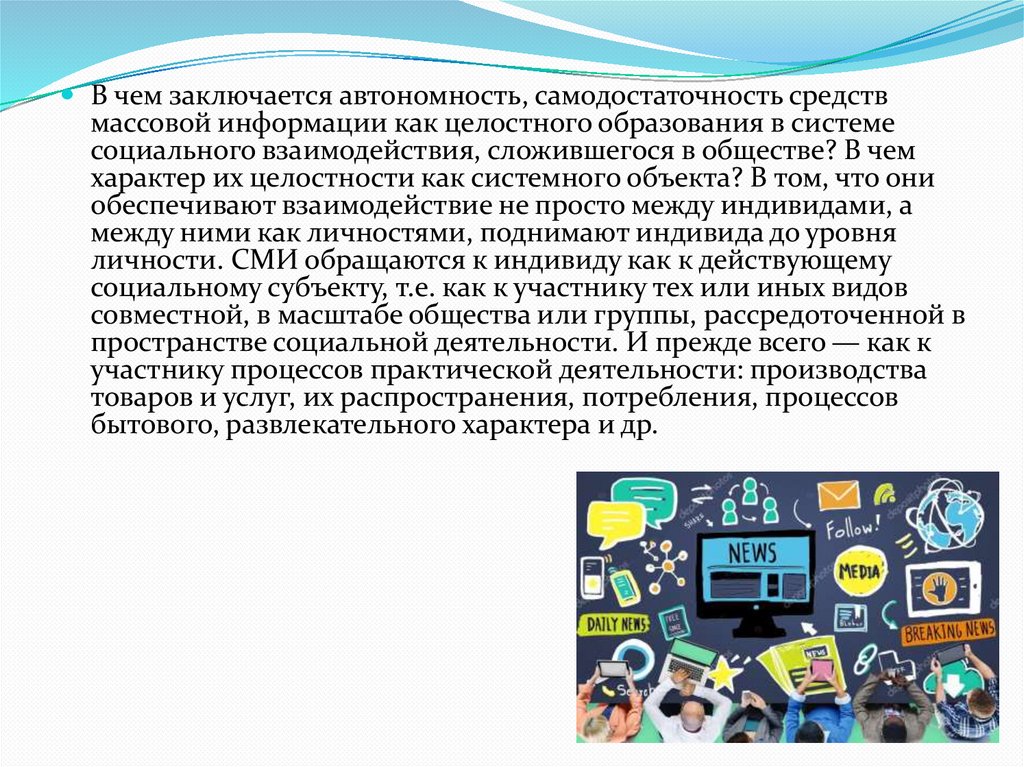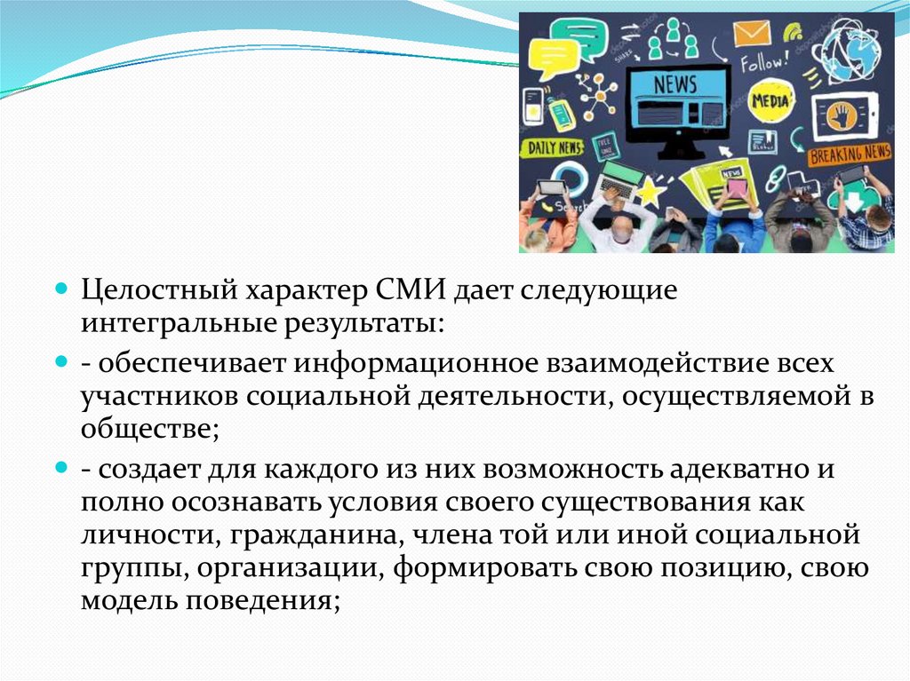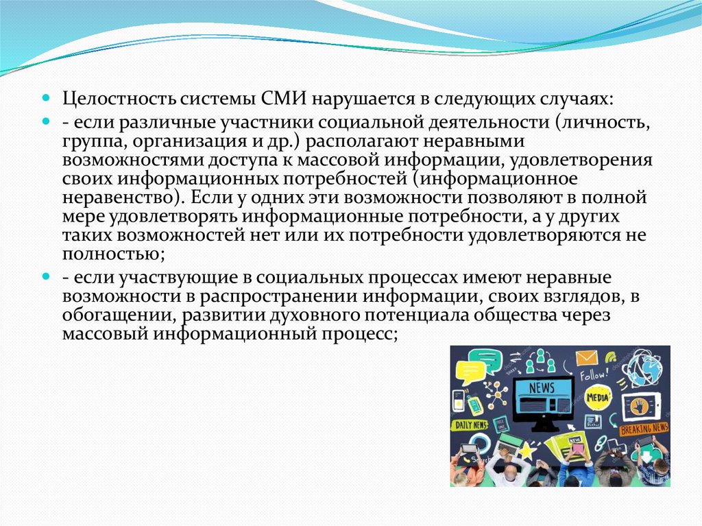 Целостность системы СМИ нарушается в следующих случаях:- если различные участники социальной деятельности (личность,