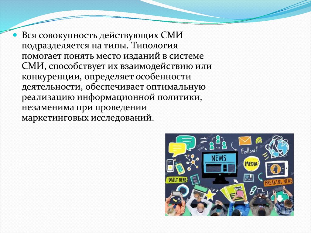 Вся совокупность действующих СМИподразделяется на типы. Типология