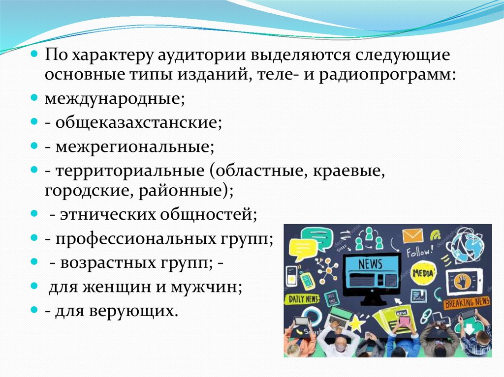По характеру аудитории выделяются следующиеосновные типы изданий, теле- и радиопрограмм: