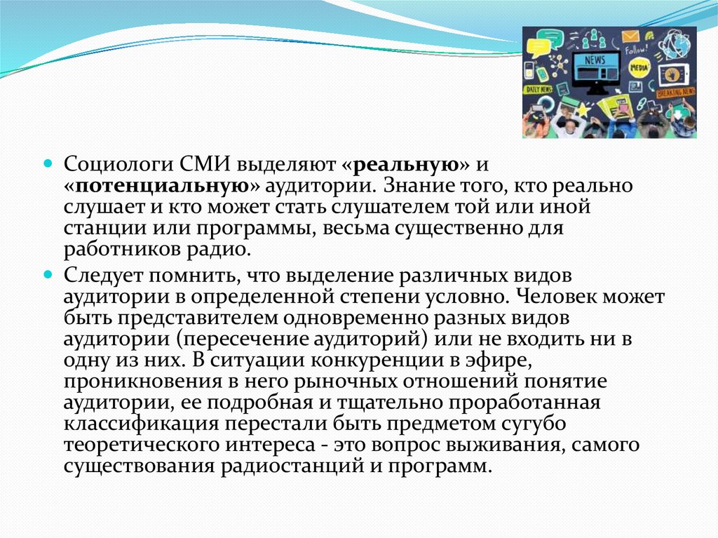Социологи СМИ выделяют «реальную» и«потенциальную» аудитории. Знание того, кто реально
