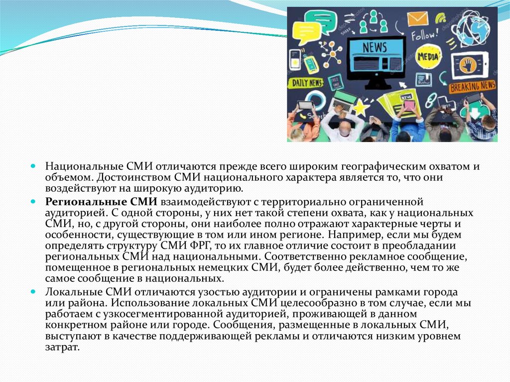 Национальные СМИ отличаются прежде всего широким географическим охватом иобъемом. Достоинством СМИ национального характера является то, что они