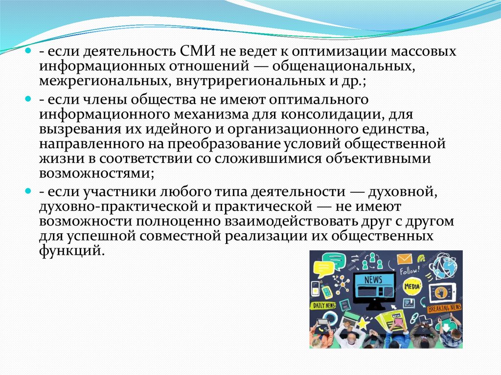 - если деятельность СМИ не ведет к оптимизации массовыхинформационных отношений — общенациональных,