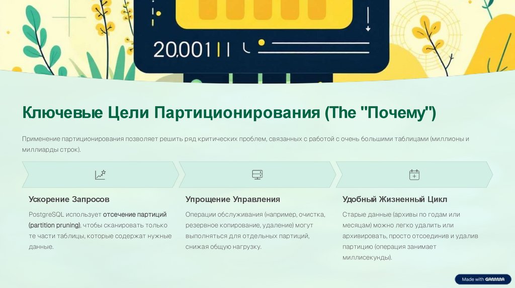 Ключевые Цели Партиционирования (The "Почему")Применение партиционирования позволяет решить ряд критических проблем, связанных с работой с очень большими таблицами (миллионы и