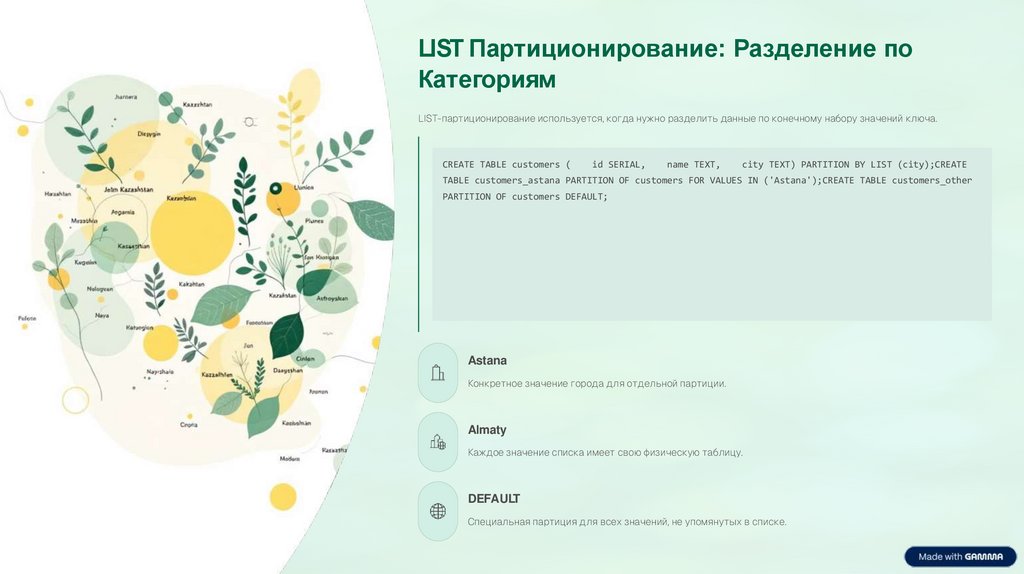 TABLE customers_astana PARTITION OF customers FOR VALUES IN ('Astana');CREATE TABLE customers_other