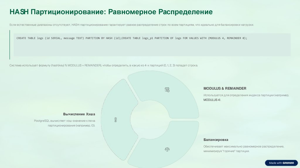 HASH Партиционирование: Равномерное РаспределениеЕсли естественные диапазоны отсутствуют, HASH-партиционирование гарантирует равное распределение строк по всем партициям, что идеально для балансировки нагрузки.