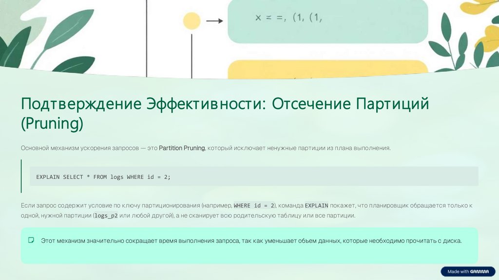 Если запрос содержит условие по ключу партиционирования (например, WHERE id = 2), команда EXPLAIN покажет, что планировщик обращается только к